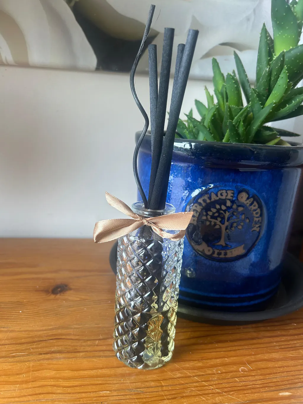 Bring effortless luxury into your home with our handmade luxury reed diffuser, designed to fragrance your space beautifully while doubling as elegant home décor. Each reed diffuser features a textured glass bottle, finished with a soft satin ribbon and black fibre reeds, complemented by a delicate flower diffuser reed for an elevated, decorative touch.